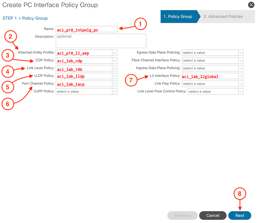 1. Name the Policy Group: aci_p10_intpolg_pc
