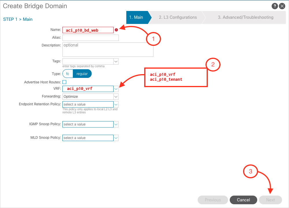 In this section you will be creating two Bridge Domains called: