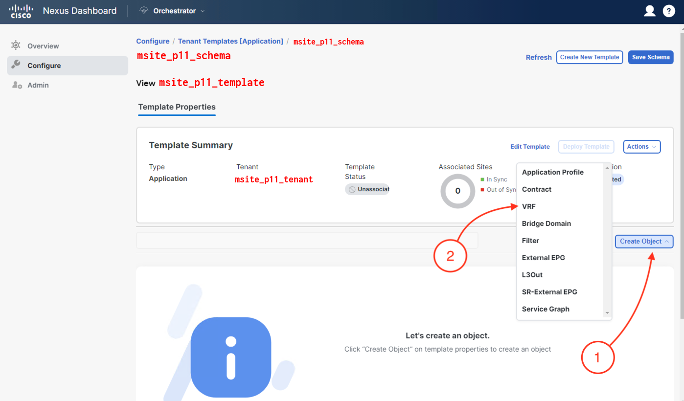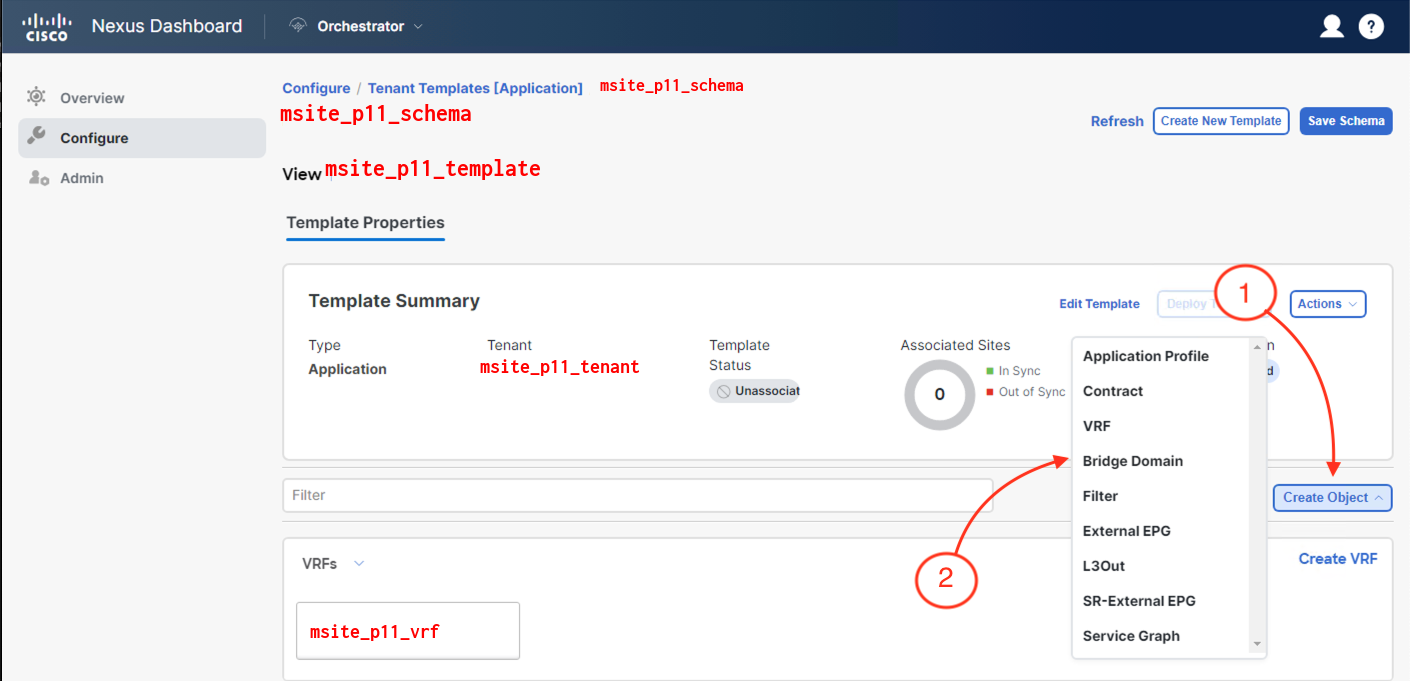 With your Tenant now associated to your Schema Template, lets start building out the policy that will be extended across data centers. The same concepts apply you have seen or are aware of within the APIC. Lets first create a VRF for your Tenant template: