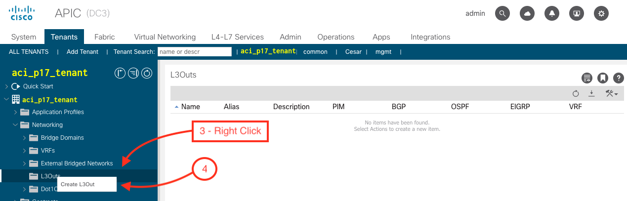 This section will cover how ACI and in particular your tenant aci_p17_tenant will be connecting outside the fabric via OSPF. For this lab each student will have their own L3 out, but in some instances customers may have what it is called an "L3 shared", where every tenant in the fabric will be leveraging the same L3 (connection) to go outside the fabric. What that means is, ACI can provide the flexibility to minimize the number connections in a multi-tenant environment.