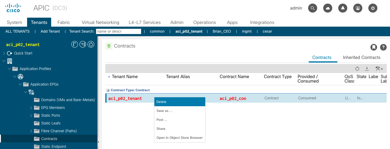 In this section, we will be creating the Endpoint Security Group (ESG) use case where end points will be able to communicate without the need of creating a contract between the aci_p02_epg_web and aci_p02_epg_app.