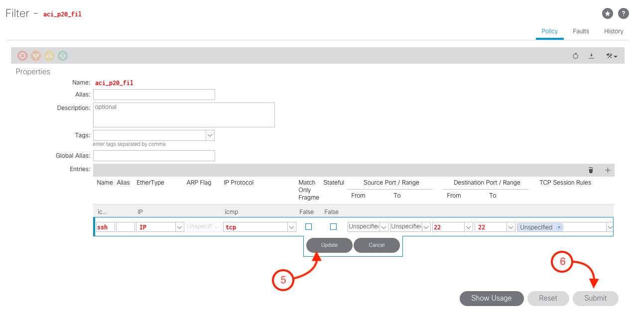 If you recall in the previous section we created a contract between POD20-WEB-SRV-01 and POD20-APP-SRV with a filter only allowing icmp. Therefore, because of this filter only ICMP is allowed to communicate. Now we need to add a filter to allow ssh traffic.