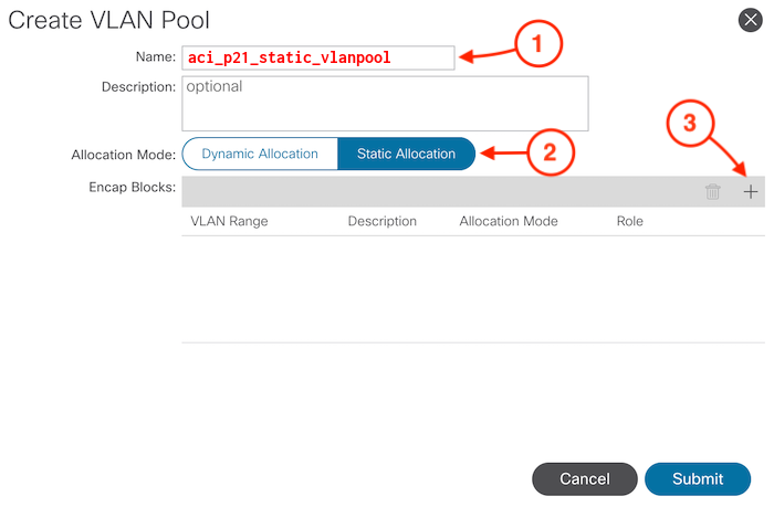 1. Name the VLAN Pool: aci_p21_static_vlanpool