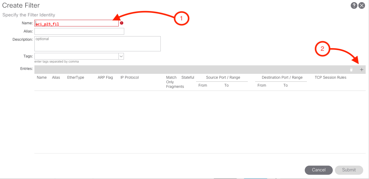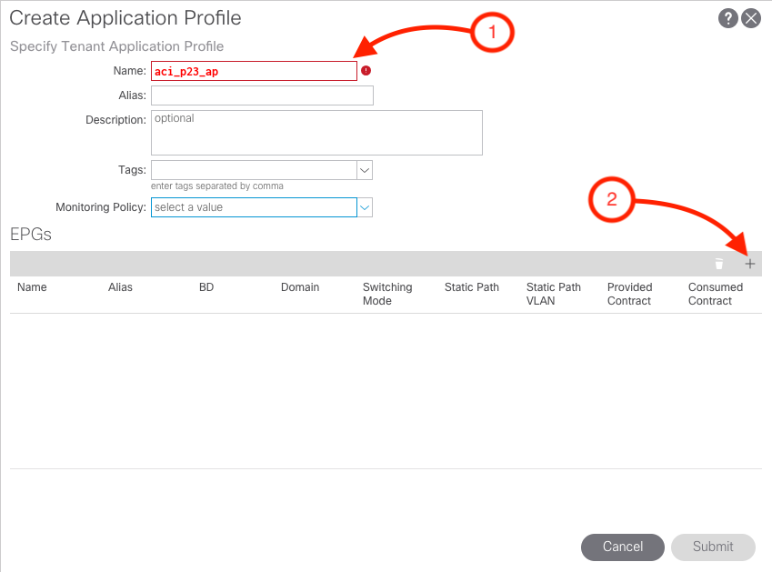 The first step is to named the Application Profile aci_p23_ap. It is important not to click Submit until we have finished creating the entire Application Profile.