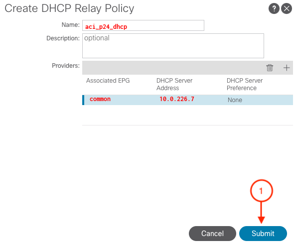 With this the DHCP relay label should be created and you can verify the value under the BD definition in the fabric.