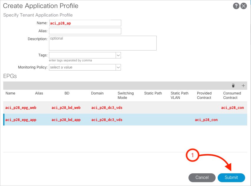 The first step is to named the Application Profile aci_p28_ap. It is important not to click Submit until we have finished creating the entire Application Profile.