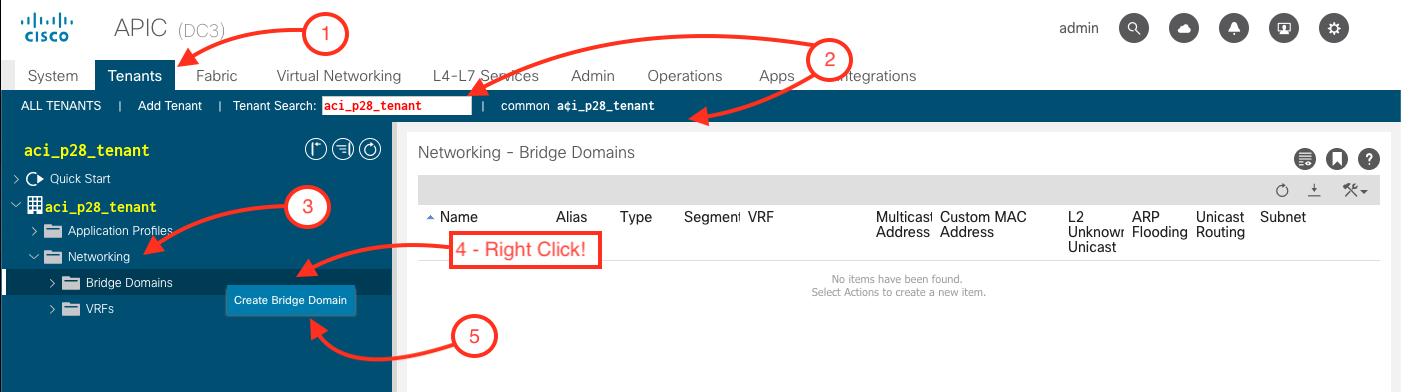 Step 1 - Navigate to Bridge Domains in the Tenants Tab under Networking