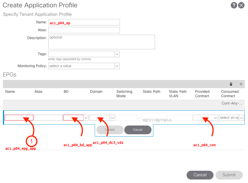 The first step is to named the Application Profile aci_p04_ap. It is important not to click Submit until we have finished creating the entire Application Profile.