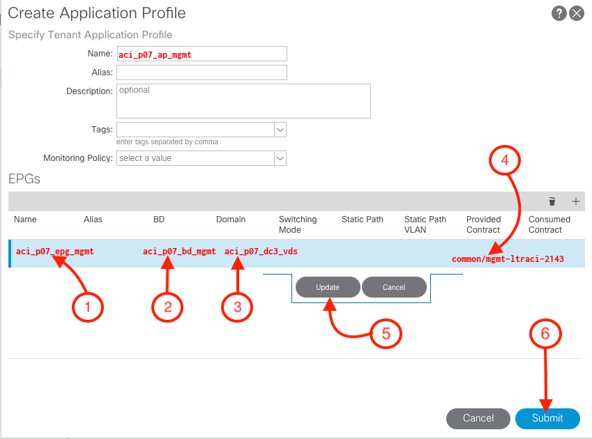 In this step, we will be creating one EPG named aci_p07_epg_mgmt which will allow Virtual Machines to be able to communicate to the Management Network.