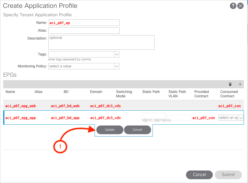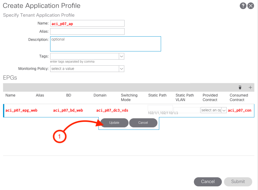 The first step is to named the Application Profile aci_p07_ap. It is important not to click Submit until we have finished creating the entire Application Profile.