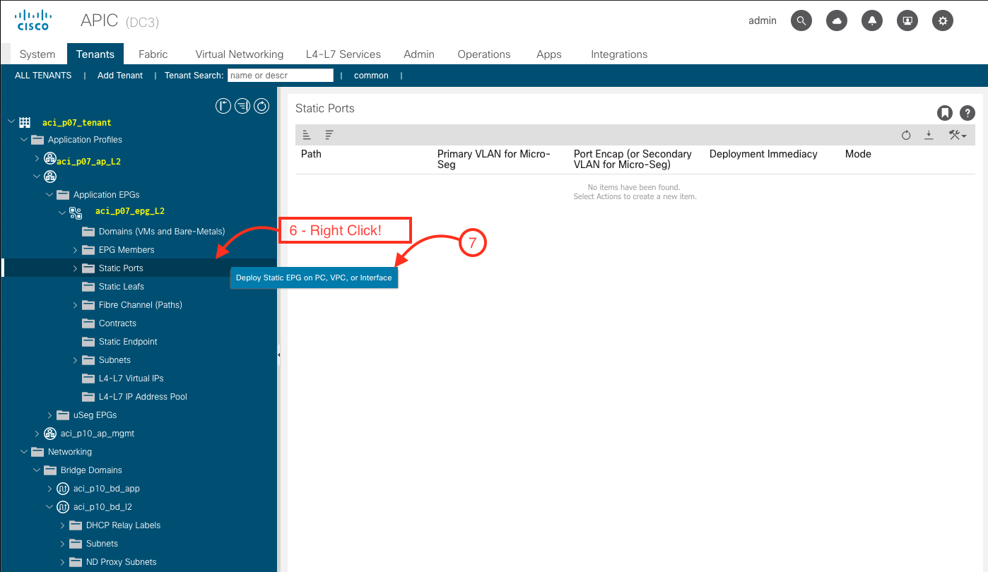 In this step we will be adding the physical ports to our EPG in order to establish a connection to the outside of the fabric. We will be connecting to a N7K via Port-Channel. In order to add Static Ports, we need to follow these steps: