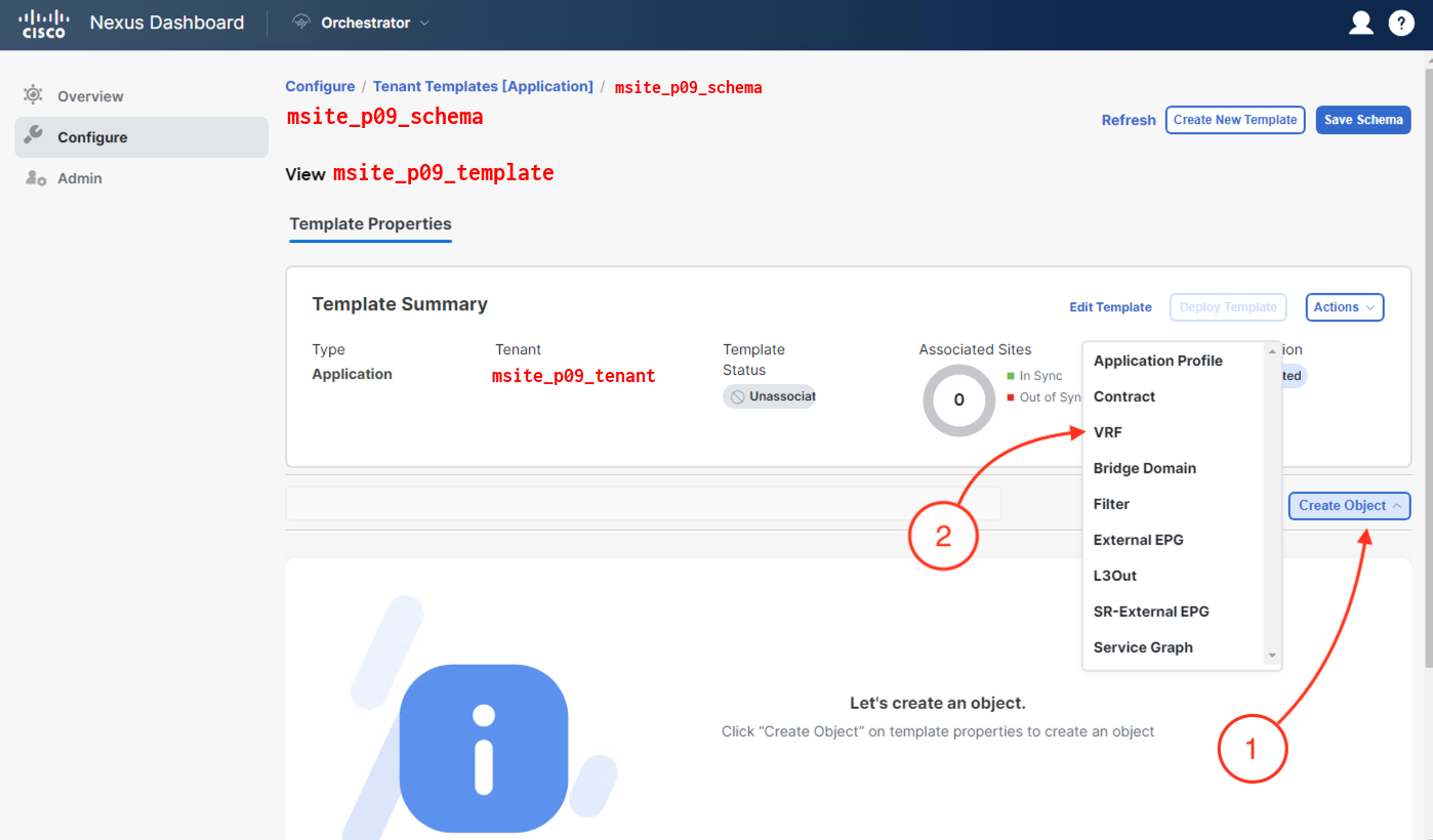 With your Tenant now associated to your Schema Template, lets start building out the policy that will be extended across data centers. The same concepts apply you have seen or are aware of within the APIC. Lets first create a VRF for your Tenant template: