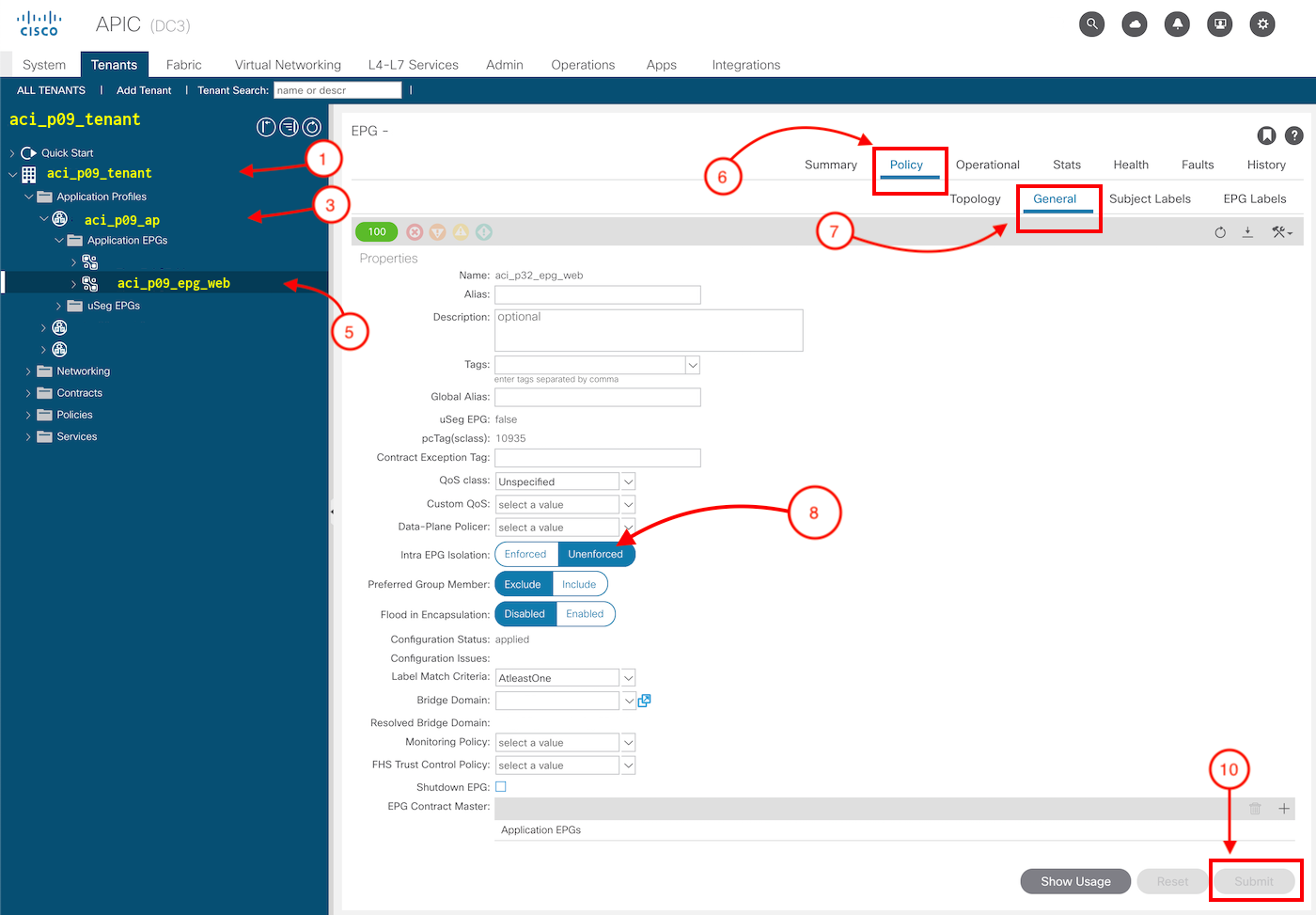 Let's revert back the Intra EPG isolation setting to Unenforced. In order to do this we need to do the following steps: