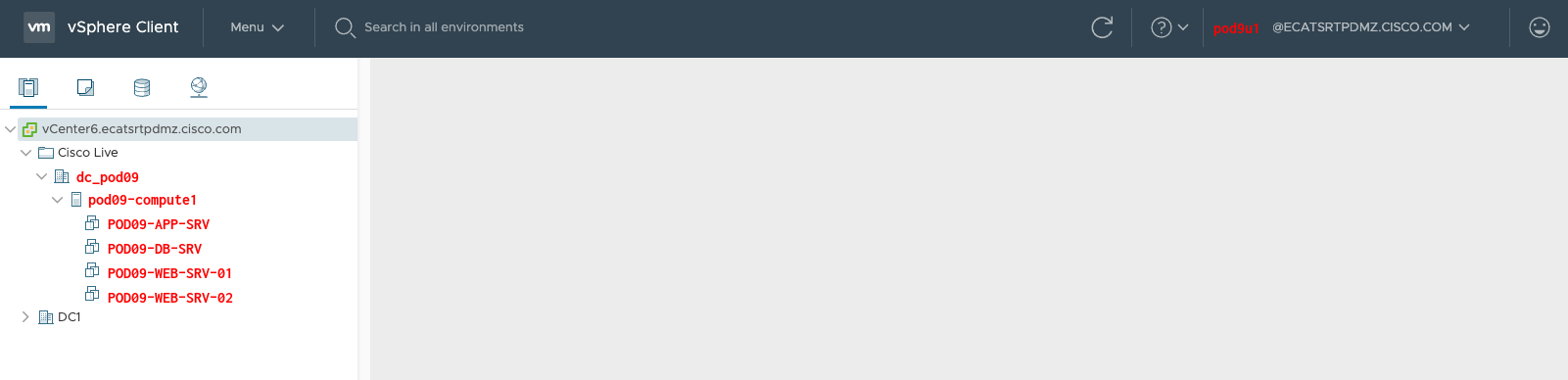Once you logged to VMware vSphere Webb Client, you should see the following screen which includes your DC, hosts and the 4 VMs that we will be leveraging during this section.
